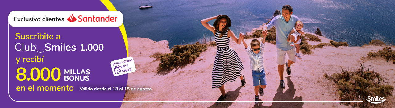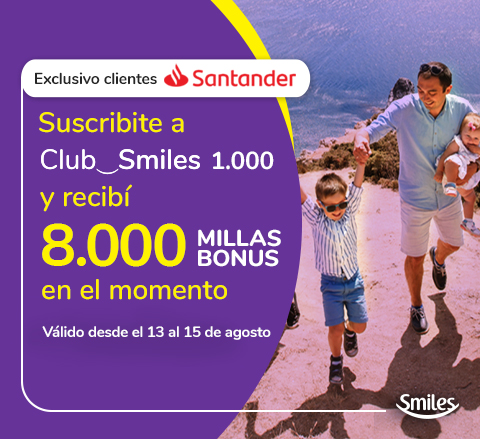El acceso a la promoción es exclusivo a través de esta página web. Promoción válida para clientes que se adhieran a Club Smiles con una tarjeta de crédito de Santander.
